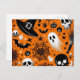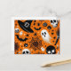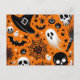 A orange colored background with scary ghosts, skulls, bats and pumpkings