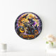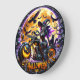 This image is a decorative wall clock with a vibrant and spooky Halloween theme. The clock face features a witch with purple hair riding a motorcycle, accompanied by a black cat on the back seat. The front wheel of the motorcycle is a glowing jack-o'-lantern. In the background, a large, yellow full moon is surrounded by flying bats and crows. The clock's numbers are scattered around the border, and the phrase "HALLOWEEN IS COMING" is prominently displayed at the bottom. The overall colour scheme is a mix of purples, oranges, and blacks, creating a festive and spooky atmosphere.