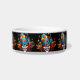 This is a heavy, durable bowl decorated with Tibbies of many colors, the perfect size for hungry/thirsty Tibs. The design is interesting and printing clear.