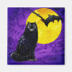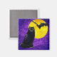 Eine schwarze Katze und eine Fledermaus bei Nacht auf einem Friedhof vor dem Hintergrund eines großen gelben Mondes. Das Bild vermittelt eine geheimnisvolle Stimmung.