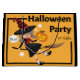 Illustration of a Halloween Party bag, featuring a cartoon witch riding a broomstick. She is dressed in a black witch's hat with red stripes, a black dress, and red and white striped socks. She holds a glowing jack-o'-lantern in one hand. The background is orange with the word "Halloween".