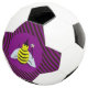 This awesome soccer ball features a cute little yellow bee wizard with black stripes. The Bee has big shiny black eyes and cute little black antennae. The wings of the bee are folded back to look like a cape. The bee is wearing a tall black hat with orange and purple stars on it. It is also holding a magic wand that is star shaped and sparkles with lots of different colours.