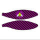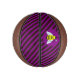 The background is a pattern of purple and black stripes.