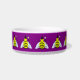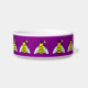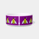 This awesome pet bowl features a cute little yellow bee wizard with black stripes. The Bee has big shiny black eyes and cute little black antennae. The wings of the bee are folded back to look like a cape. The bee is wearing a tall black hat with orange and purple stars on it. It is also holding a magic wand that is star shaped and sparkles with lots of different colours.