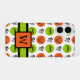 This playful Halloween design features a repeating pattern of orange and lime green circles with bats, spiders, and spooky “Eek!” text on a crisp white background. A bold black-and-green stripe frames a striking orange monogram centerpiece, creating a fun, festive look. The bright colours and whimsical Halloween icons bring a cheerful yet spooky charm perfect for the season.