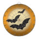 This dart board has a dark orange background with the moon in the centre and three bats flying in front of the moon.