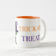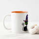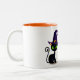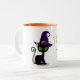 Coffee Mug shown in orange and white with a Halloween witch cat print design.