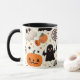 Product Description: This is a special mug filled with the spirit of Halloween. It is a perfect item for the Halloween season as it depicts various Halloween characters such as cute ghosts, pumpkins, witches, and more. Enjoy some Halloween fun with a warm drink from this mug!