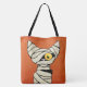 Awesome halloween tote bag featuring a cartoon style mummy cat covered with bandages with one huge yellow eye and a cute pink nose showing. Perfect for use as a trick or treat bag by all ages! Design copyright © Lisa Marie Robinson
