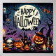 Celebrate a "Happy Halloween" with this incredibly detailed and vibrant design, packed with all the beloved elements of the holiday. Featuring a grinning jack-o'-lantern wearing a witch's hat, an array of smaller pumpkins, flickering candles, skulls, a spooky haunted castle, and a ghostly figure, all set against a large full moon with flying bats. This rich design captures the ultimate festive and frightful spirit of Halloween night, perfect for any product.