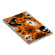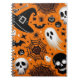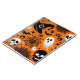 A orange colored background with scary ghosts, skulls, bats and pumpkings