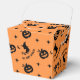 Fill these festive favour boxes with treats and surprises for your Halloween party guests! These charming and spooky boxes feature a playful and eerie pattern of black silhouettes, including grinning jack-o'-lanterns, witches flying on brooms, stars, and crescent moons, all set against a vibrant orange background. The charmingly creepy "BE VERY AFRAID" text adds a perfect touch of Halloween spirit. With their scalloped top edge, these boxes are perfect for holding candy, small toys, or baked goods, making them the ideal party favour for your Halloween bash.