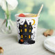 A Halloween themed paper cup featuring a spooky house with pumpkins, bats and a yellow moon. Perfect for Halloween parties, decorations and drinks.