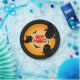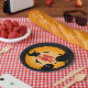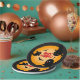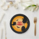 Cute Halloween paper party plates with black ghosts and bats against an orange background. Happy Halloween is written in the centre.