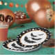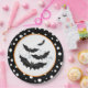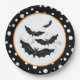 Halloween party paper plate is shown in a black and white polka dots design with a bats print.