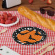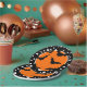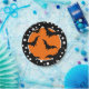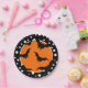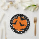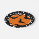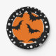 Halloween party paper plate is shown in a black and white polka dots design with a bats print.