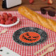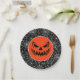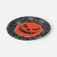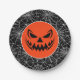 Halloween party paper plate is shown with a festive spider webs and scary pumpkin face print.