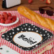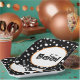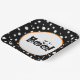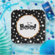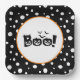 Halloween party paper plate is shown in a black and white polka dots design with a Boo! print.