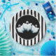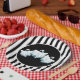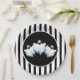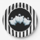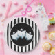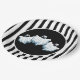 This Halloween paper plate is shown with a festive black and white stripes and ghosts design.