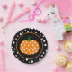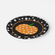 Halloween party paper plate is shown in a black and white polka dots design with a pumpkin print.