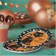 Halloween party paper plate is shown in a black and white polka dots design with a black cat print.