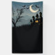 Halloween party backdrop or background for photo booth with haunted house, mountains, moon, bats, bare tree. Fun party photography prop for selfies or portraits.