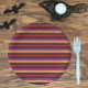 Some colourful paper plates for your Halloween party with some orange , red , purple and black bumpy stripes .