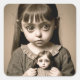 Creepy ai artwork little girl with big eyes holding a creepy old antique doll. Seal your Halloween invitations or candy favour bags with this scary little girl.