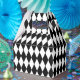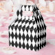 This party favour box is shown in a black and white Harlequin diamond pattern print.
