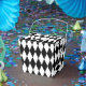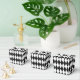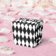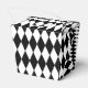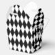 This party favour box in a take out style is shown in a black and white Harlequin diamond pattern print.