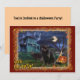 Spooky scene with two black cats in front of a haunted house with ghosts, bats, a pumpkin and a witch flying on a broom across a full moon. Text "Join the Party". Backside text "You're Invited to a Halloween Party!". Remember to personalise General Info about Party, Date / Time, Location, RSVP