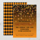 Halloween party invitation featuring jack o' lanterns raining down on a dramatic gradient orange and black background. On the other side of the card there is a black and orange chequered pattern.