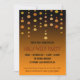 Halloween party invitation featuring jack o' lanterns on strings with a dramatic gradient orange and black background. On the other side of the card there is a black and orange chequered pattern.