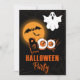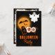 Halloween Party Invitation with Ghost Boo and Moon. Festive invitation card for Halloween costume party. Editable holiday flyer. Create your own fun card and invite your friends to a Halloween party. Indicate the date time and place of your fun party.