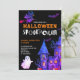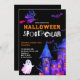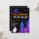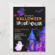 Halloween Spooktacular party Invitation featuring design of a haunted house, ghosts and bats flying and a wicked witch on her broomstick. Celebrate with an all out spooktacular Halloween party with all your friends and family this Halloween!