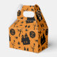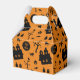 A Halloween trick or treat favour box for those candies and chocolates! It has many Halloween elements which include silhouettes of cats, bats, trees, tombstones, owls, withered trees, jack-o-lantern carved pumpkins and eerie looking possibly haunted houses. Text reads Trick or Treat. A colour palette of black and orange with bits of white.