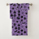 A whimsical Halloween pattern filled with spiders, bats, bones, pumpkins, haunted houses and candy corn. Black on a purple background.