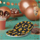 Candy corn paper party plates with pattern of randomly strewn candy corn pieces on a customisable black background and customisable text that reads, "Happy Halloween" - perfect for a kids' or adults' Halloween bash - by katz_d_zynes | part of katzdzynes' Halloween candy corn collection >>> https://www.zazzle.com/collections/119793208103154271