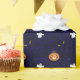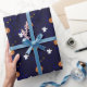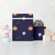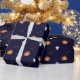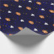 This beautiful Halloween wrapping paper is decorated with funny pumpkins, ghosts, bats and scary eyes on a dark blue background with light glitter.