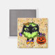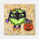Cute holiday pickle all decked out a bat mask carrying a Halloween pumpkin candy bucket.
