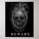 Poster is shown with a scary haunted Halloween print of a skeleton face in a magic mirror.
