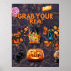 Change your space into a Halloween haven. Get this stunning Halloween poster. The text reads, "Grab Your Treat," and it is filled with spooky Halloween items. Size: 12"x16" This is a digital print printed on high-quality poster paper, which makes the colours pop out and gives it a natural look! Get ready for Halloween today.