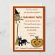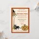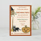 This cute quirky halloween party invitation features illustrations of a broom, an owl dressed for halloween , a lucky black cat, a smiling pumpkin and a leaning witch's broom. The design is in light orange and brown, giving a festive fall feel to your fun fancy dress halloween party. The fall colours and barn-like arrangement of the images are suited to any family hallowe'en gathering- cute and folksy.