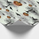Vibrant Halloween design featering a glowing pumpkin with bright eyes and teeth in a dark landscape with trees and ravens.