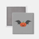 An illustration of a cute cartoon halloween orange pumpkin bat with black wings. This magical creature design is a gift idea for magic or spell lovers and treat or trick lovers.