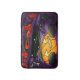 A black cat wearing purple robes and metal chains, a witch hat with candles and holding a laughing glowing pumpkin.