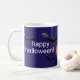 Happy Halloween mug with pumpkin and cool black cat, witch flying on broomstick in the moon, and cool bats