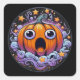 A pumpkin with large, expressive eyes and an open mouth appears shocked against a swirling background of stars and whorls of pastel colours. The overall effect is both whimsical and captivating, evoking a playful sense of surprise.