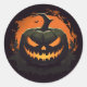 Round sticker is shown with a Halloween scary pumpkin print.