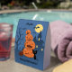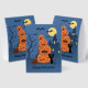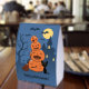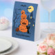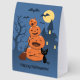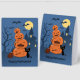 Cute black cat and a witch broom near a stack of laughing pumpkins that are falling over. A dead tree, a creepy mansion, some bats, and the moon are seen on the background.